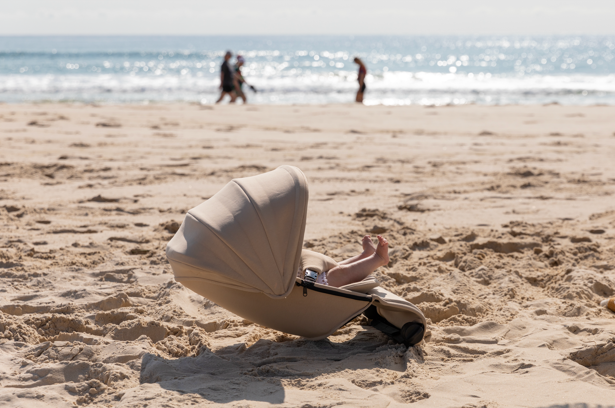 The Beachy Bum Bouncer is lightweight, foldable, and built for easy use. It features breathable mesh for airflow, a UV-rated sunhood for sun protection, and a secure design.